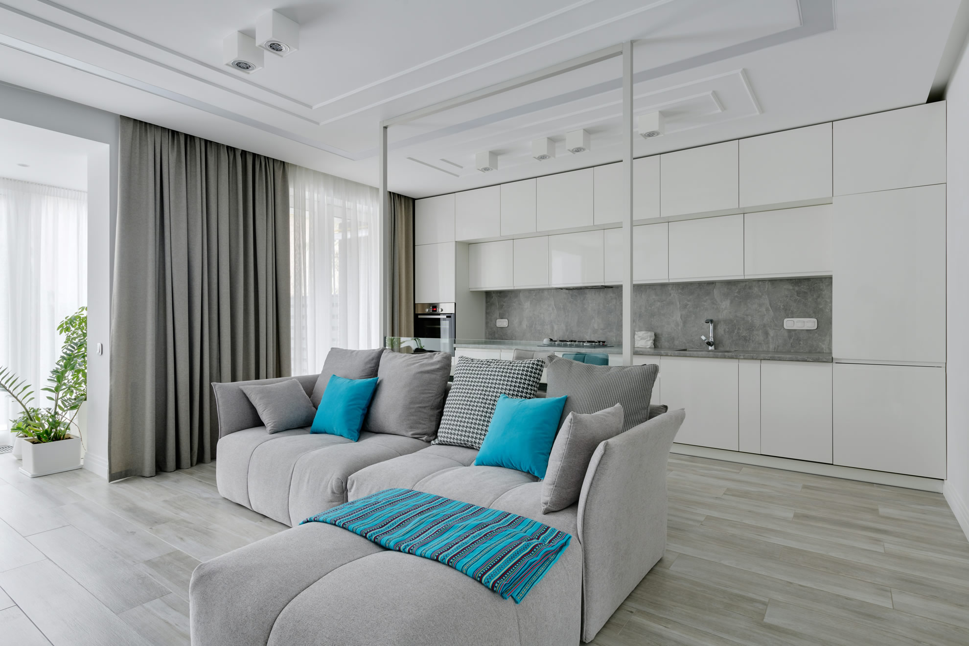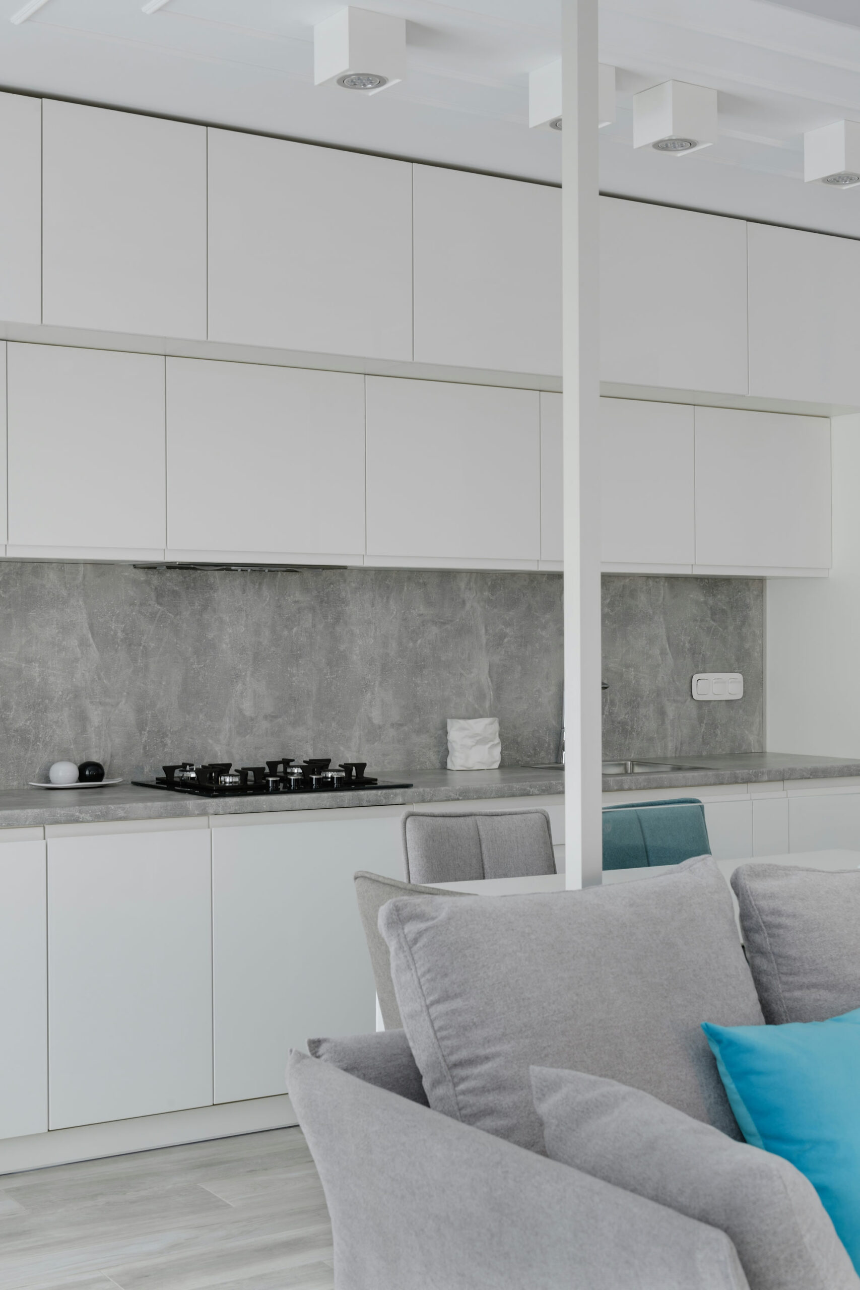 Built-in fridge and ample cupboards, the perfect kitchen for a modern, minimalist environment.