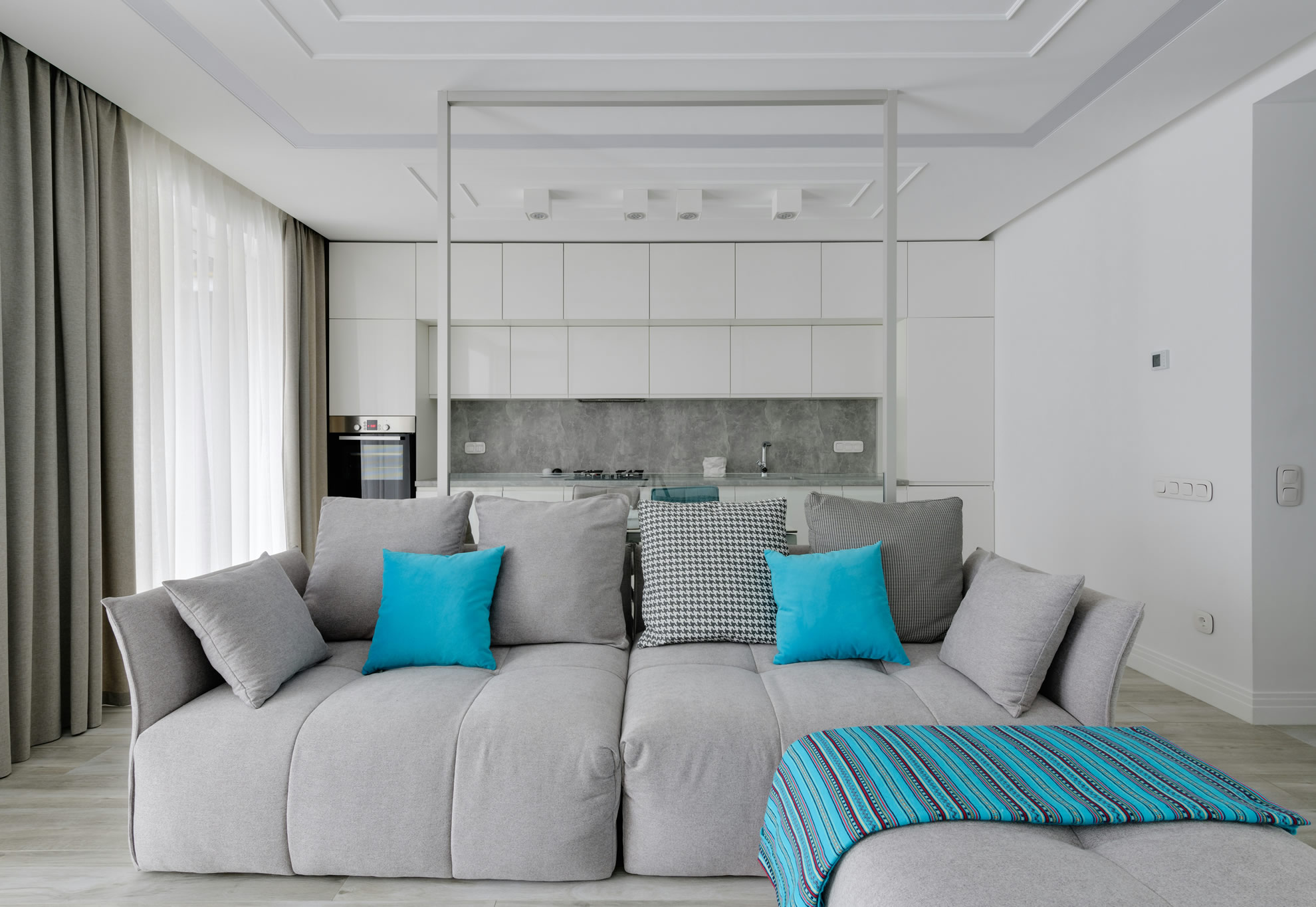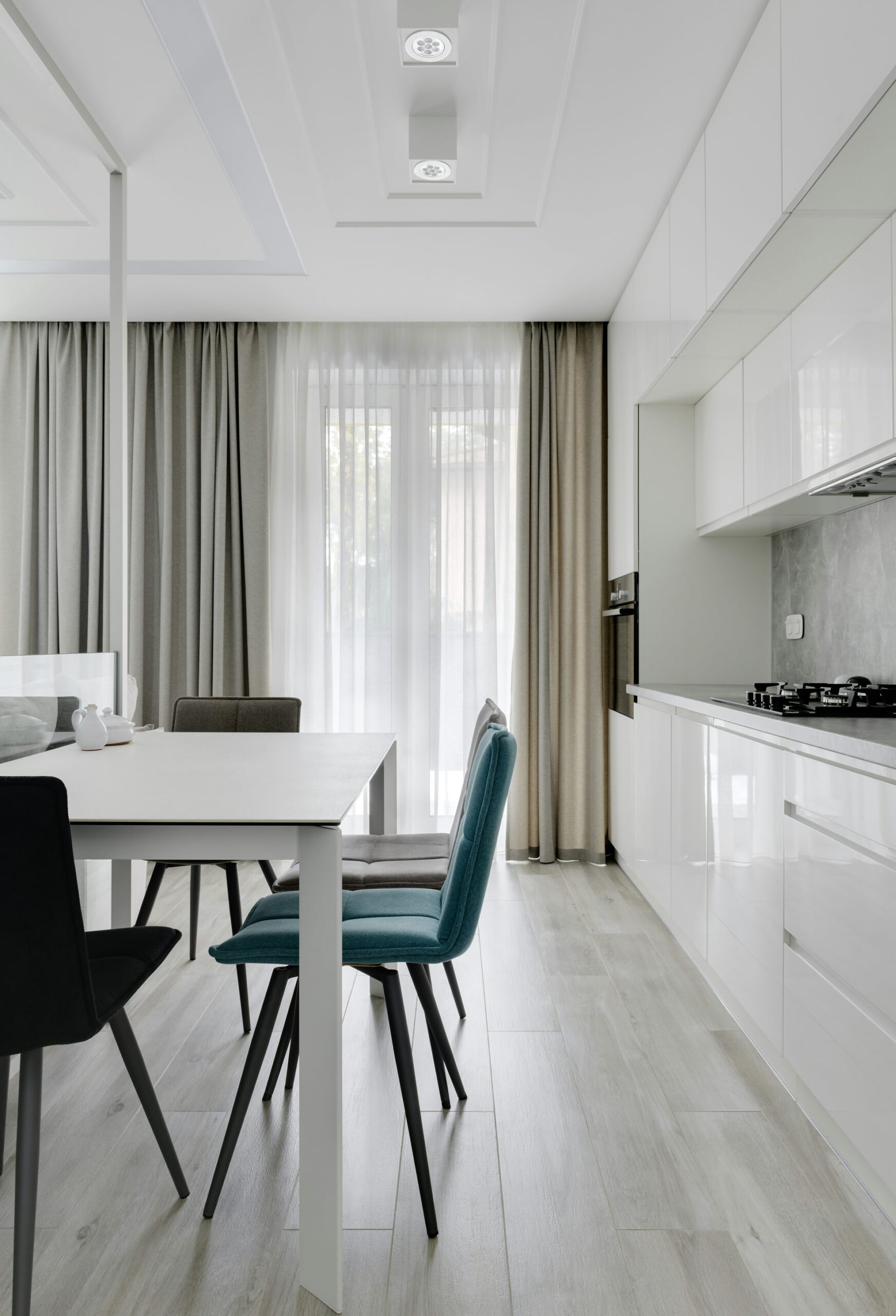 Amplitude with a neutral design makes this kitchen a true work of art. Straight shapes, finished in Cristallo white. Handleless doors with BLUM tip-on touch system.