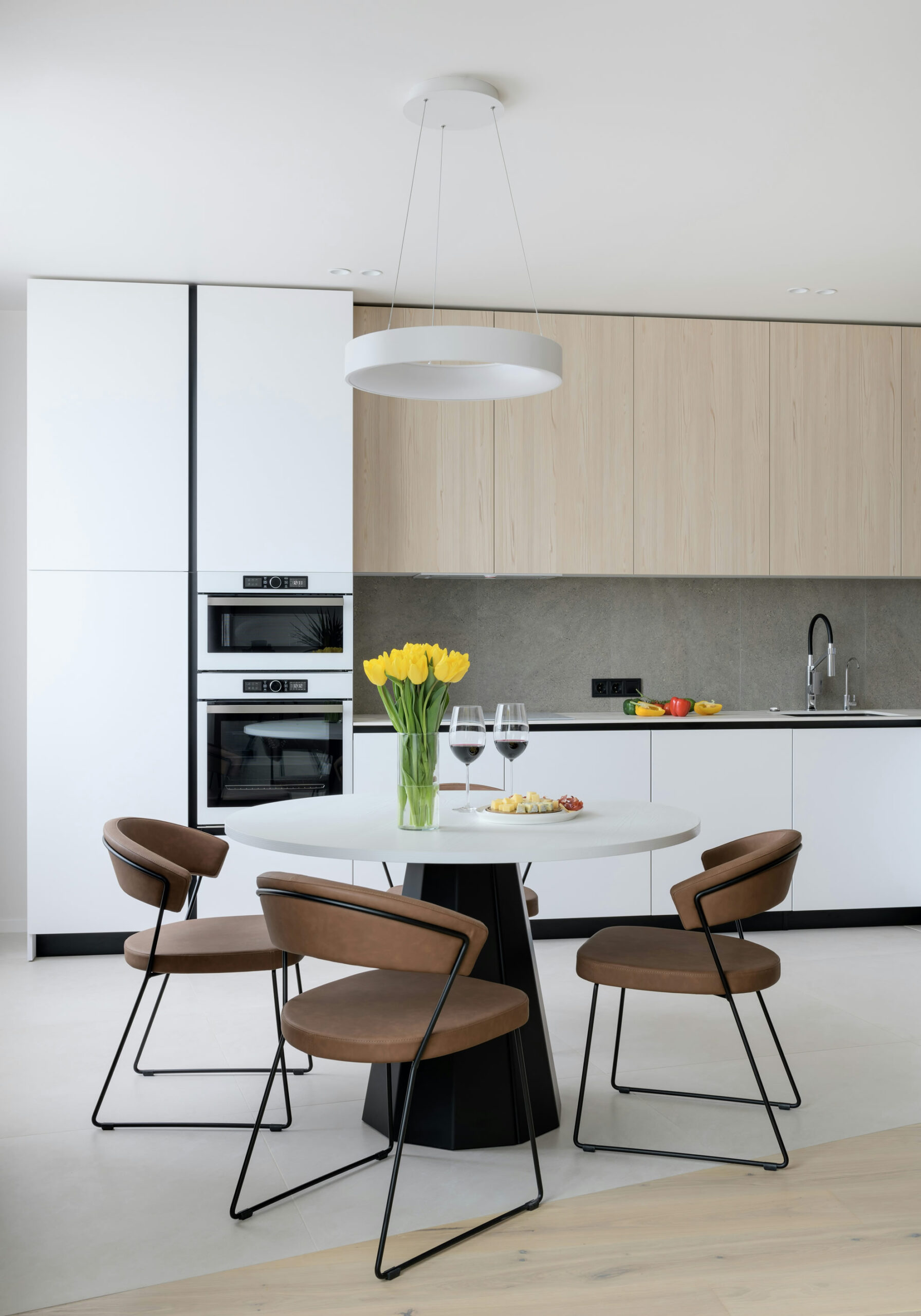 Functional kitchen without neglecting a refined aesthetic and a combination of neutral colors with the intention of bringing space into the room. Straight shapes, finished in matt white. Doors with recessed aluminum handles.
