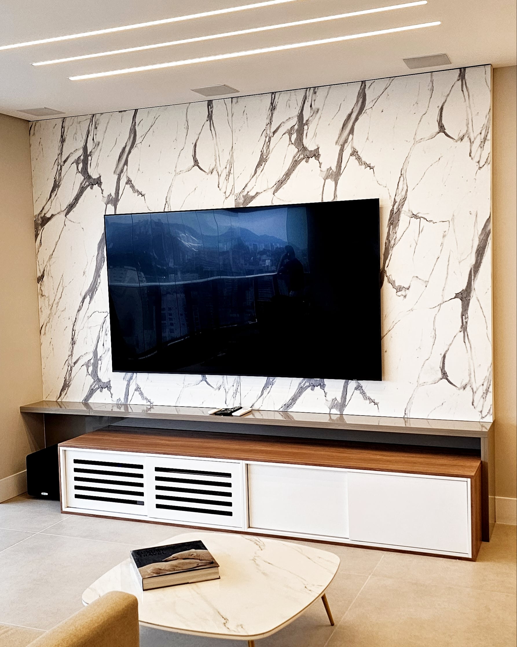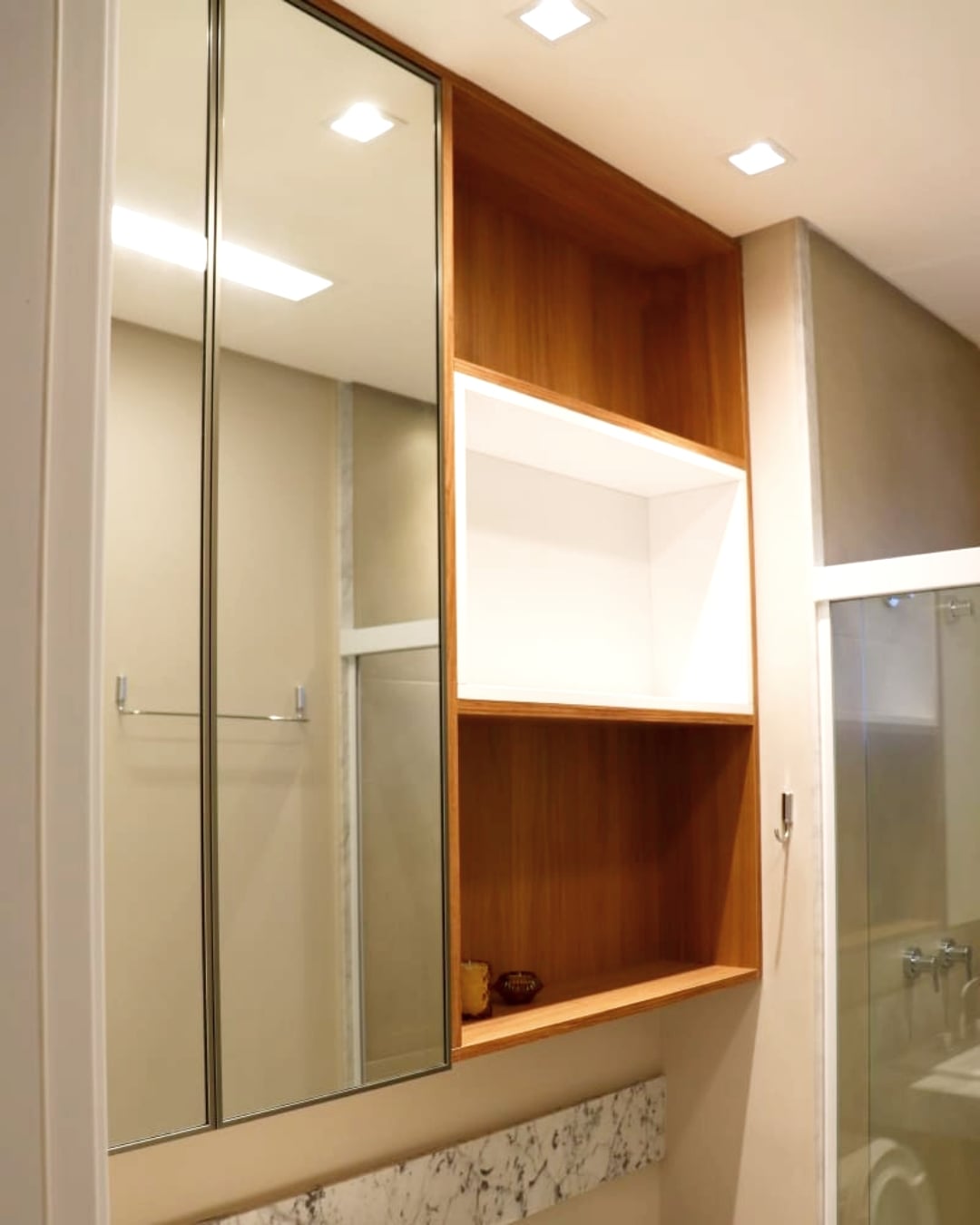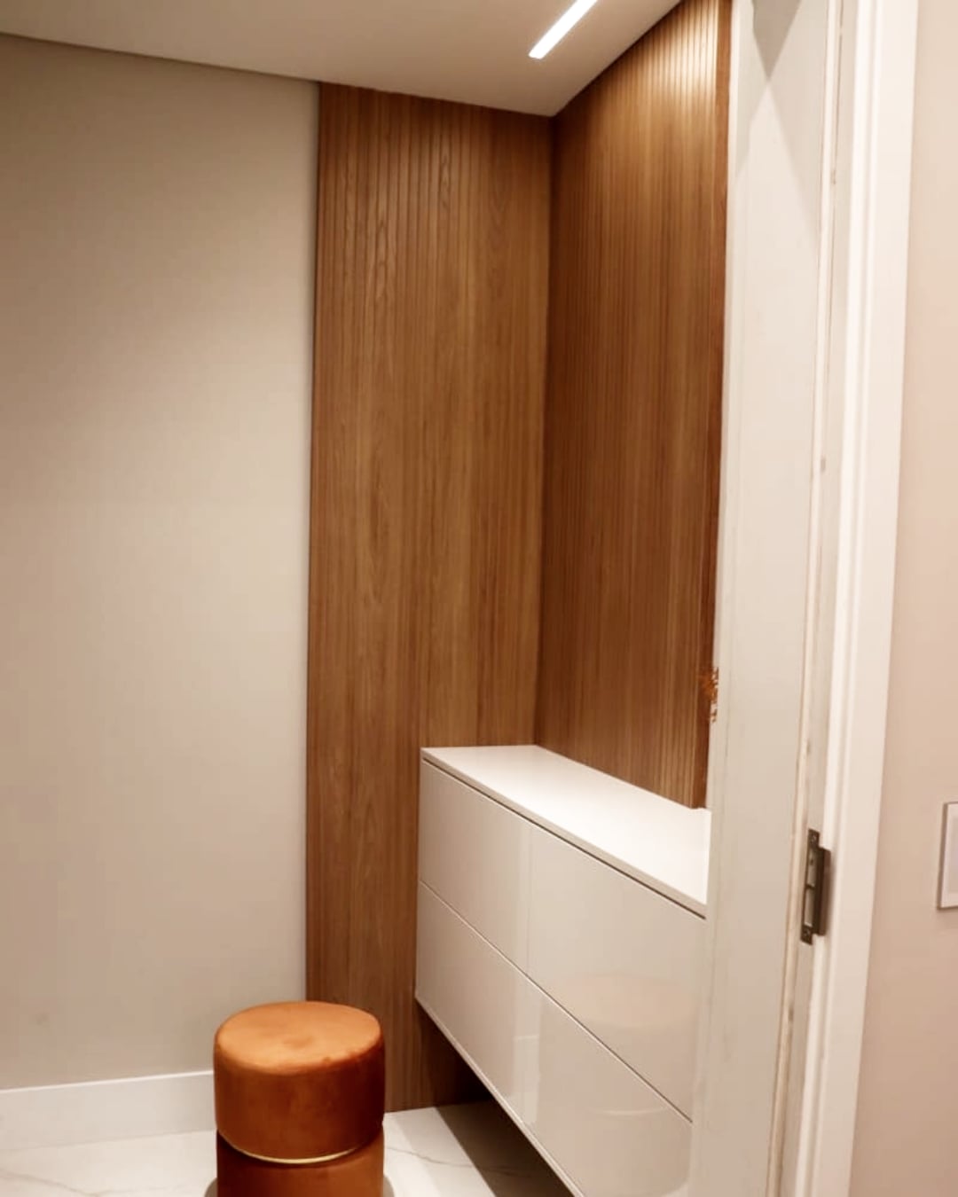 Design solutions like embedded doors on slatted panels and wood panel marble pattern were also used.