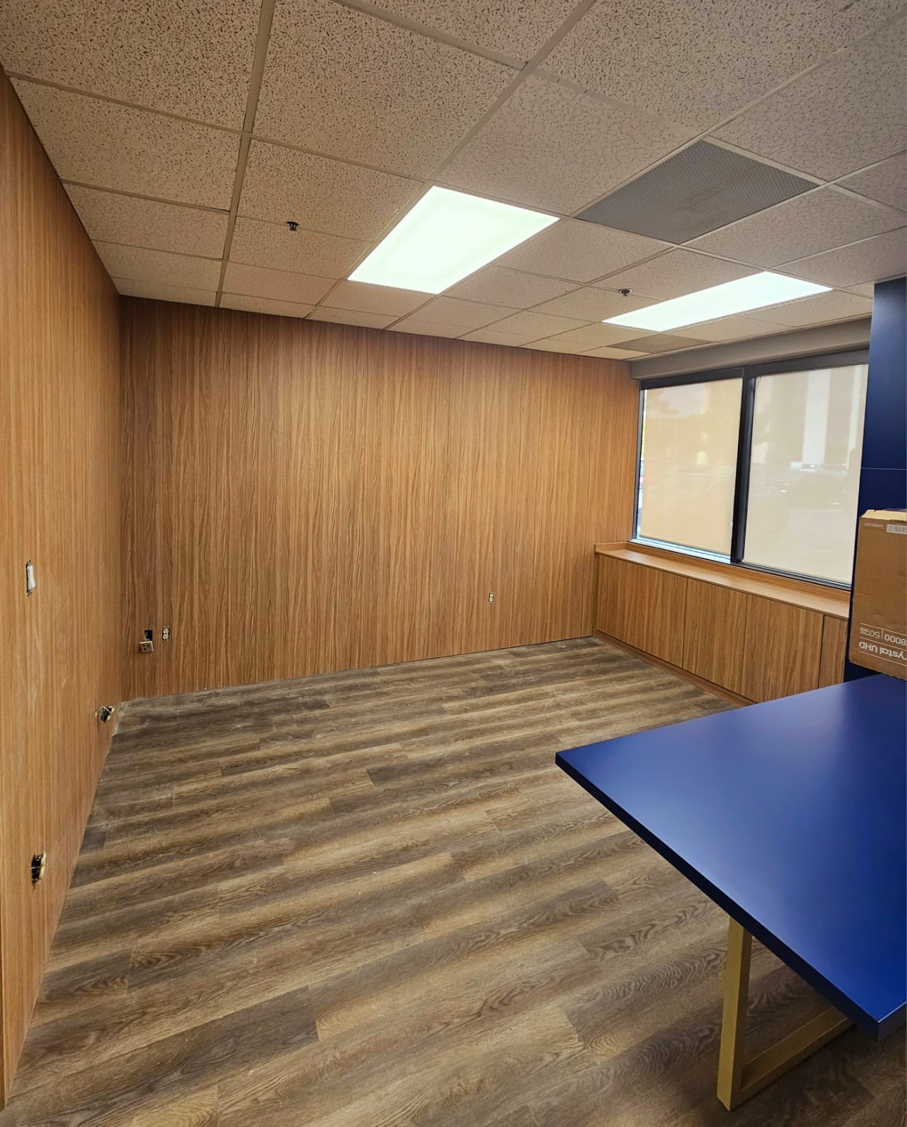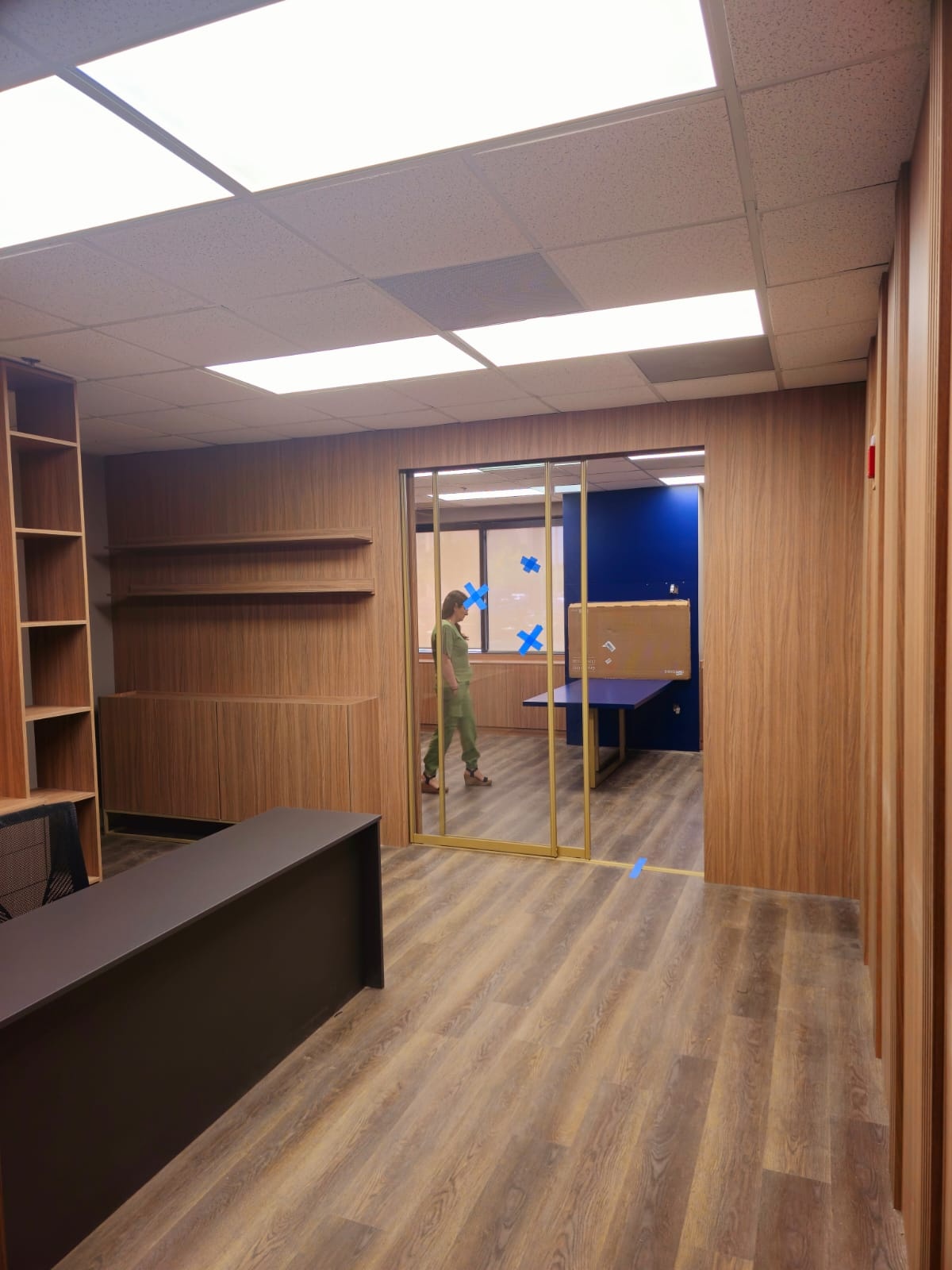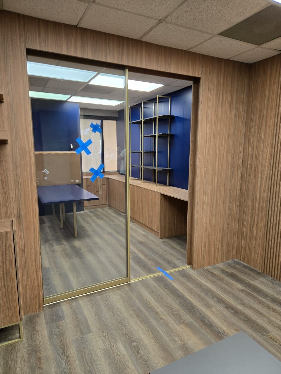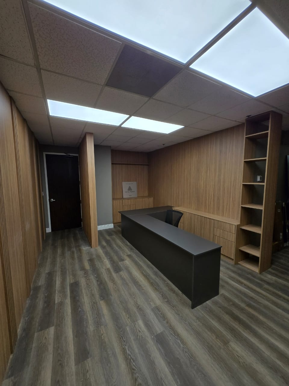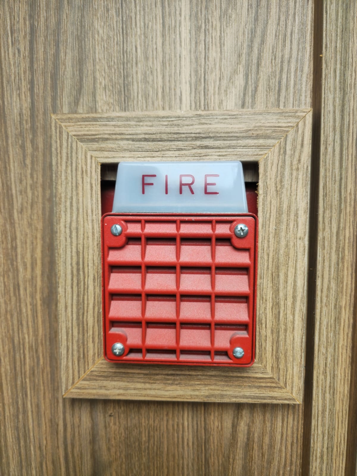 Walls were all covered in slatted and flat panels, paying attention to minimal details like a frame for the fire alarm.