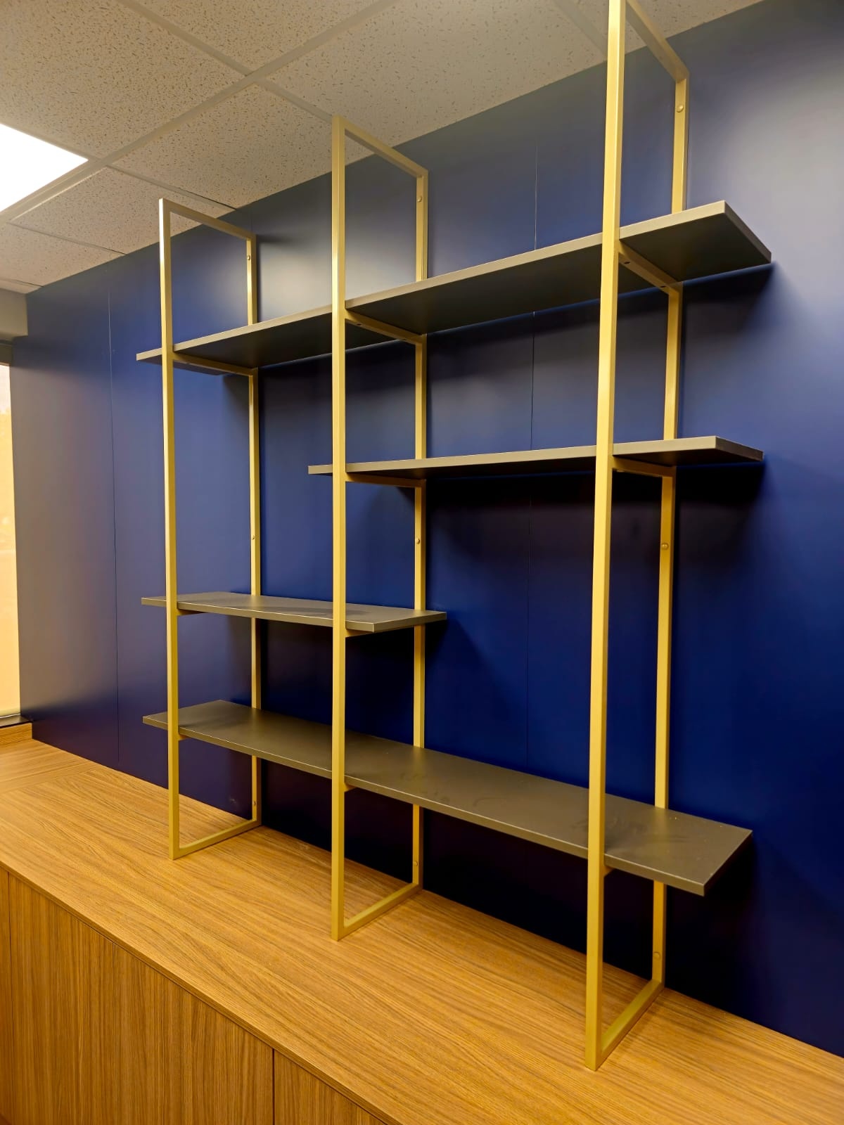 Sliding glass doors with golden metal frames matching with the golden metal square tubes of the bookcase.